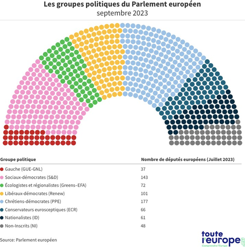 Il y a 705 députés élus dans 27 pays membres répartis dans 7 groupes politiques européens, qui ne sont pas les mêmes que les groupes politiques en France :