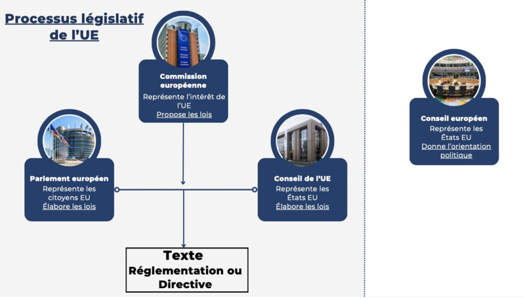 Au sein de l’UE, il y a 4 grandes institutions : La Commission, le Parlement Européen, le Conseil de l’UE et le Conseil européen. Le seul qui représente les citoyens c’est le Parlement Européen. Ses membres sont élus directement par les citoyens européens et doivent défendre leurs intérêts en priorité.