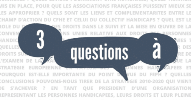 Depuis janvier 2021, la newsletter du CFHE s’enrichit régulièrement d’une rubrique spéciale : « 3 Questions à ». À travers ces entretiens courts, nous abordons des sujets d’actualité tels que l’impact du contexte sanitaire sur les personnes en situation de handicap ou encore les avancées législatives récentes concernant le handicap au niveau national, européen et international.